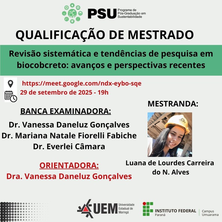 29/09/2025 - QUALIFICAÇÃO DE MESTRADO - Mestranda: Luana de Lourdes C. do Nascimento Alves - Orientadora: Dra. VanessanDaneluz Gonçalves